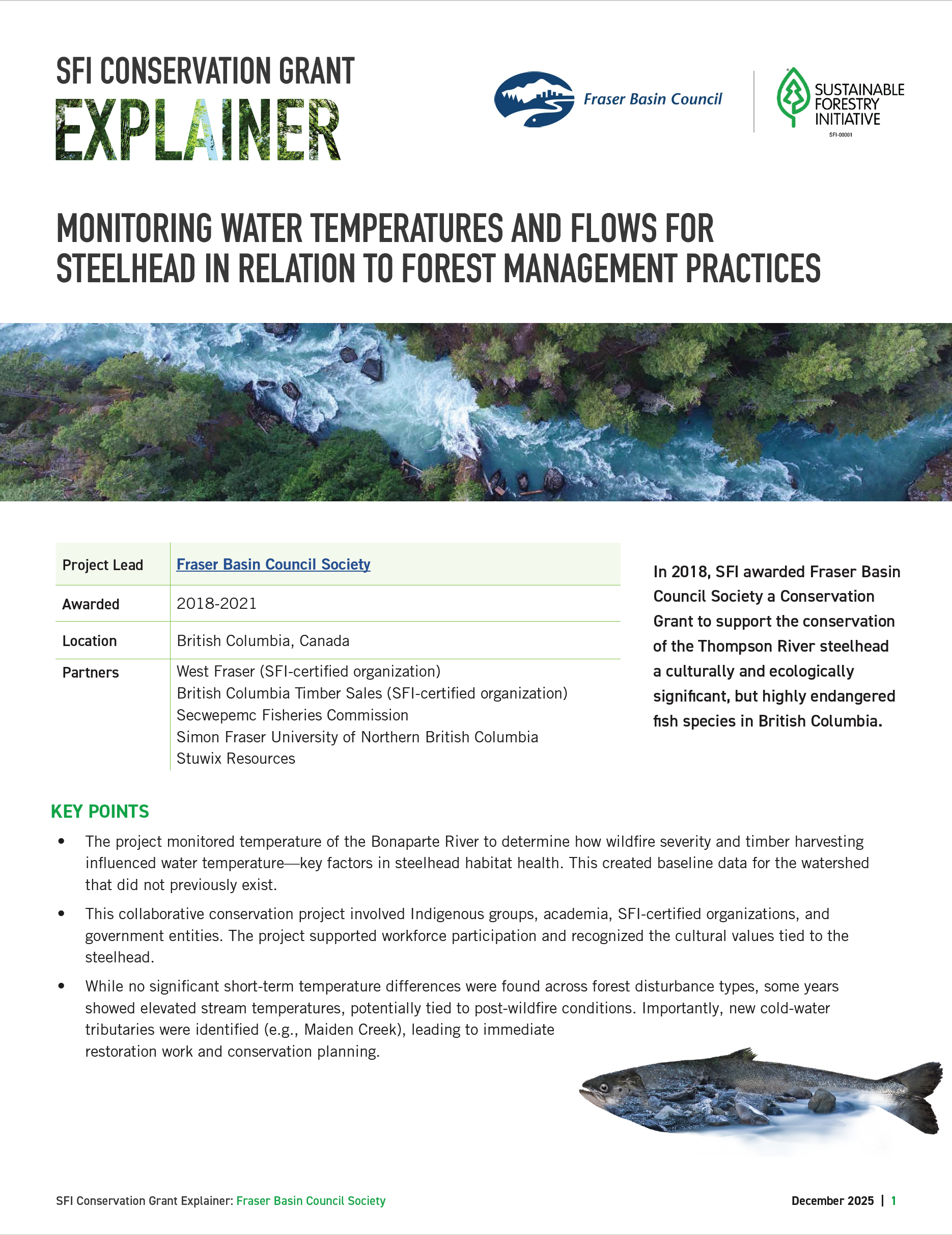 This project will help address the need to incorporate recognition and respect for Indigenous Peoples’ rights and traditional knowledge into sustainable forestry practices. It will link Indigenous knowledge with scientific knowledge by assessing the effectiveness of enhanced riparian management in the Penticton Indian Band (PIB) area of responsibility in British Columbia. The project will showcase how implementing the SFI 2022 Forest Management Standard and the PIB Enhanced Riparian Standards integrate recognition of Indigenous rights and drive improved management and outcomes for Indigenous values relating to water quality on SFI‑certified forestlands.