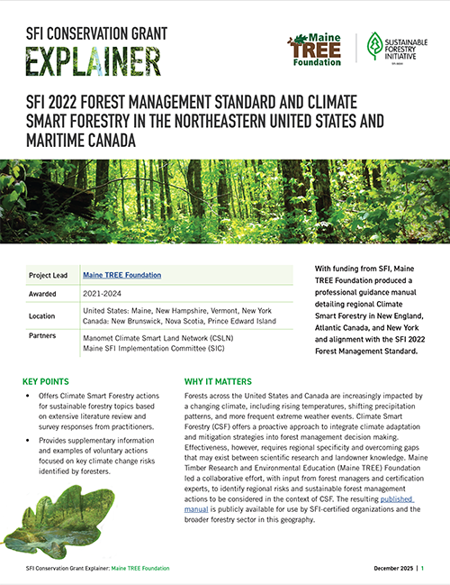 These results are expected to enlighten our understanding of best forest management practices for added carbon, which is a compelling story and will be valuable to SFI Program Participants who want to communicate their contributions to climate change mitigation. Future potential certification of additional sites in Maine could contribute to the creation of new demonstration sites and teaching tours relative to this work and other SFI objectives related to UMaine’s University Forest.