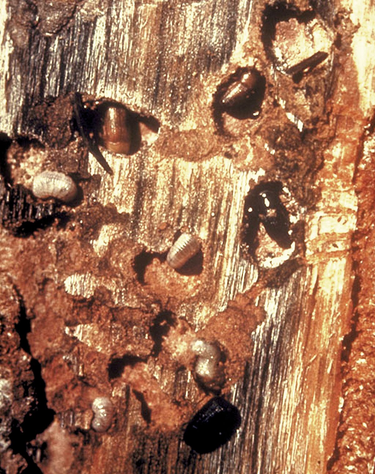 Adult mountain pine beetle and larvae. Image: David McComb, USDA Forest Service, Bugwood.org.