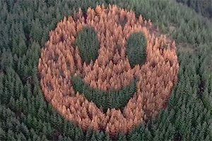 Ici, en Oregon, on peut clairement voir la différence entre le mélèze occidental, à feuilles caduques, et le sapin de Douglas dans l’aménagement en forme de « bonhomme sourire », qui a été planté près de l’autoroute 18, sur les terres de Hampton Resources, Inc. dans la chaîne côtière (Hampton est certifiée SFI). La forme apparaît à l’automne, lorsque les aiguilles des mélèzes de l’Ouest qui forment le visage jaunissent, contrairement aux yeux et à la bouche vert foncé formés par des sapins de Douglas. Cette vidéo (en anglais) explique le phénomène.