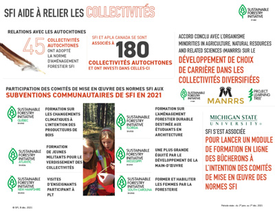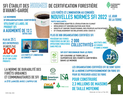 Le temps est venu de mettre en œuvre les nouvelles normes SFI 2022 qui sont essentielles à notre mission de faire progresser la durabilité par une collaboration axée sur la forêt. La norme d’aménagement forestier SFI a été mise à jour pour inclure l’objectif Foresterie climato-intelligente SFI et l’objectif de sensibilisation et de résilience aux incendies SFI. Les normes ont également de fortes implications sociales et sont plus que jamais axées sur le respect des droits et des connaissances traditionnelles des peuples autochtones et favorisent l’établissement de relations significatives axées sur la forêt. La norme d’approvisionnement en fibres SFI renouvelée a également renforcé les exigences en matière de conservation de la biodiversité.