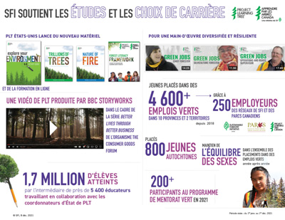 Nous continuons à former la prochaine génération de chefs de file du secteur des forêts et de la conservation par l’entremise de Project Learning Tree et d’Apprendre par les arbres Canada, qui visent à accroître la connaissance de la forêt par le développement de ressources éducatives en matière d’environnement, et à établir des choix de carrières forestières par le biais d’expériences d’emplois verts, de mentorat et d’exposition à la diversité des emplois disponibles dans le secteur des forêts et de la conservation.