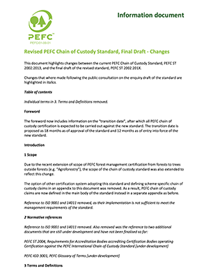 The 2020 version of the PEFC Logo Usage Rules – Requirements, PEFC ST 2001:2008 standard replaced the previous 2008 version on 14 February 2020. For organizations with a PEFC logo licence issued before the publication of this latest document, a 24 month transition period applies. The transition date is 14 February 2022.