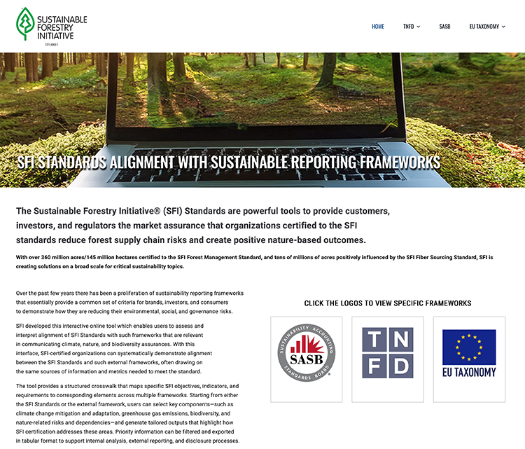WASHINGTON, D.C. and OTTAWA, ON —The Sustainable Forestry Initiative® (SFI) announced the launch of a new interactive online SFI Sustainability Framework Crosswalk tool to assess and interpret how the SFI Standards align with leading sustainability reporting frameworks, including the Taskforce on Nature-related Financial Disclosures (TNFD), the Sustainability Accounting Standards Board (SASB), and the European Union Taxonomy (EU Taxonomy). While these frameworks have unique objectives and audiences, they are striving to provide climate, nature, and biodiversity assurances. The SFI Standards were designed to deliver exactly this- providing detailed, comprehensive and rigorous requirements that are data-driven and third-party audited.